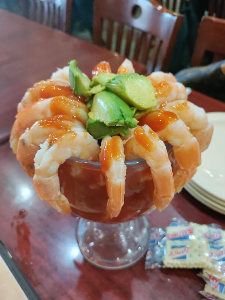 Coctel de camaron a la marinera. 14 pieces. In red sauce, tomato, onions, jalapeo, & avocado. En salsa roja, tomate, cebolla, chile y aguacate.