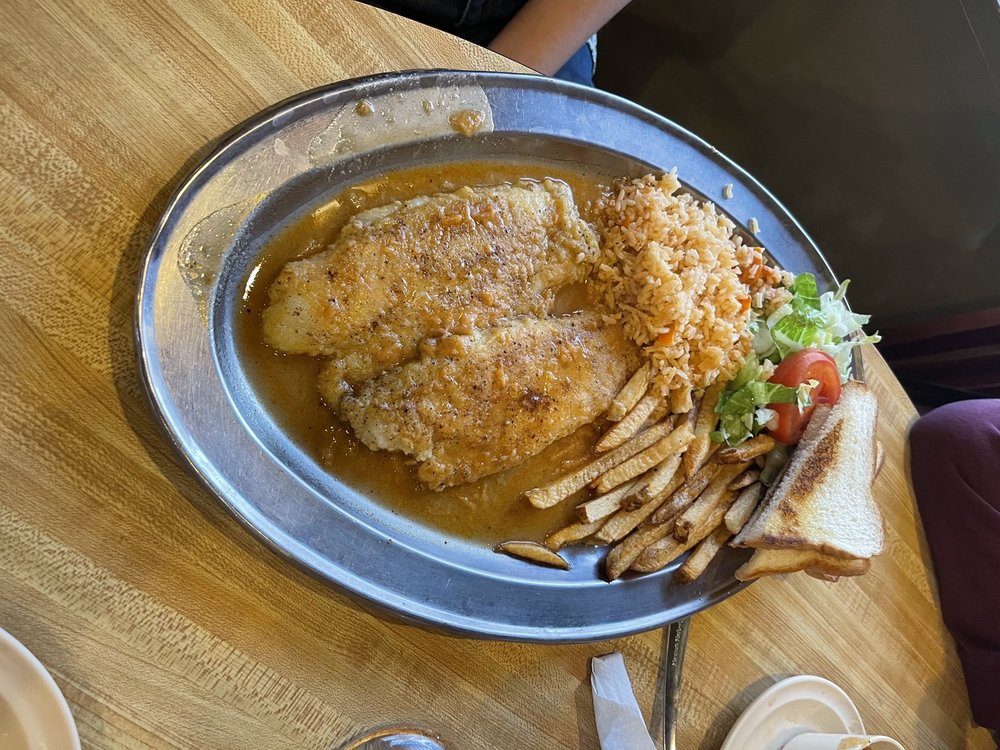 6 oz. fajitas and 2 pieces fried fish with soup, rice, beans, french fries & onion rings. 6 oz. de fajitas y 2 pieces pescado fritos. -Caldo, arroz, frijoles, papas y cebolla frita.