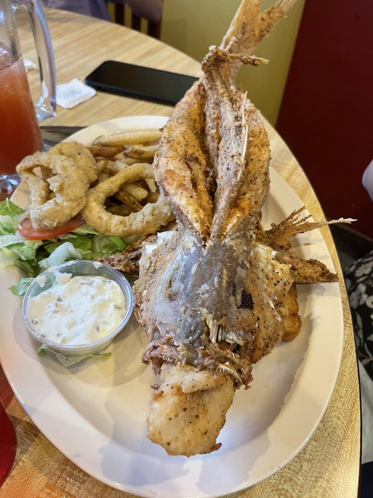 Serves 6 person. 30 shrimp, 3 lbs. fish, 6 small soups, french fries, onion rings, toasted bread, and salad.